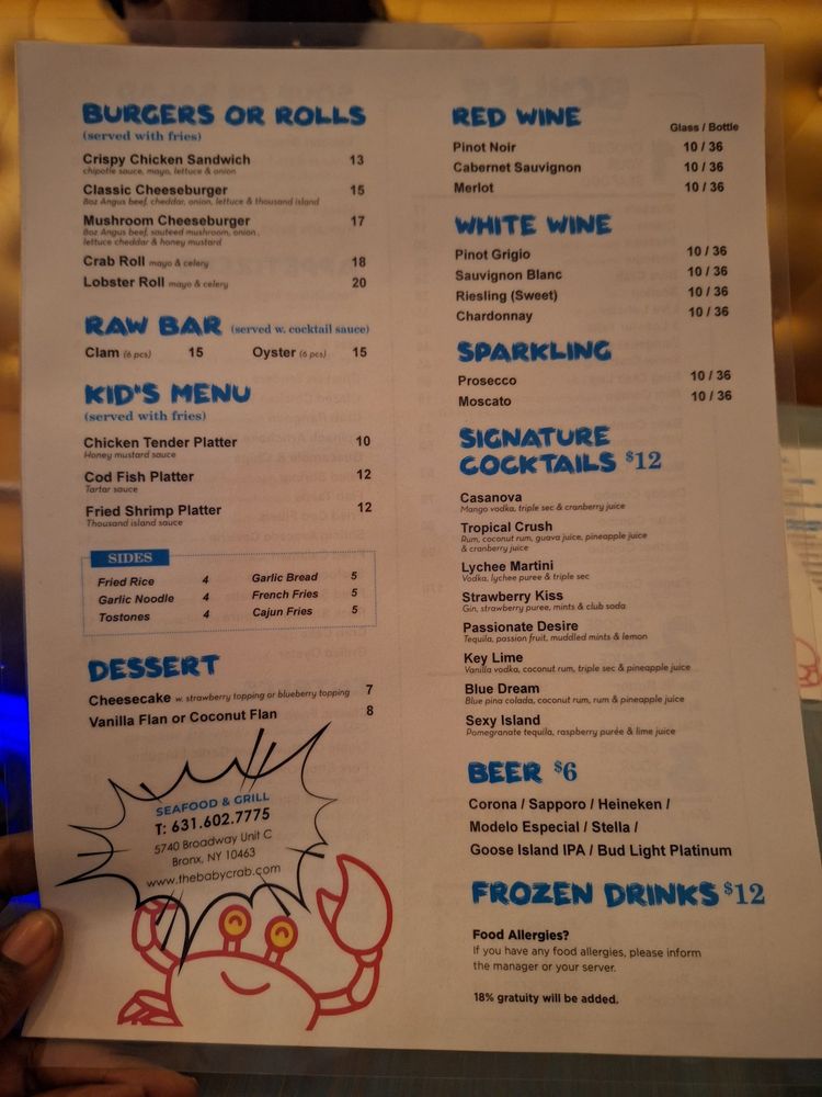 Baby Crab, located in the Bronx, is a vibrant fusion of Cajun and Creole influences, specializing in mouthwatering seafood and burgers. The menu boasts an array of fresh offerings that cater to both hearty appetites and casual cravings.